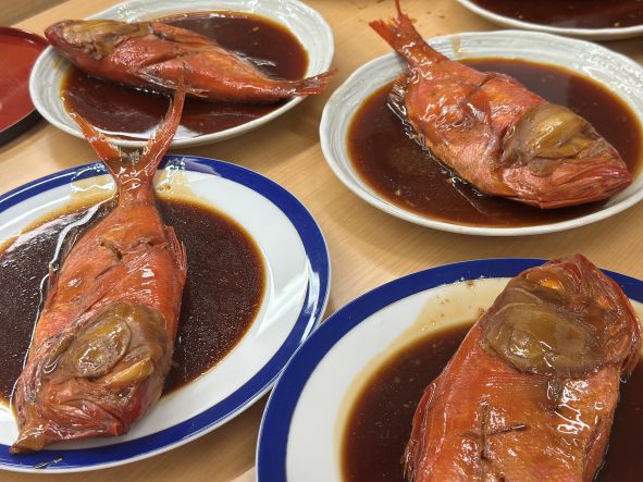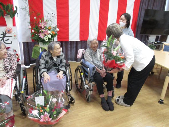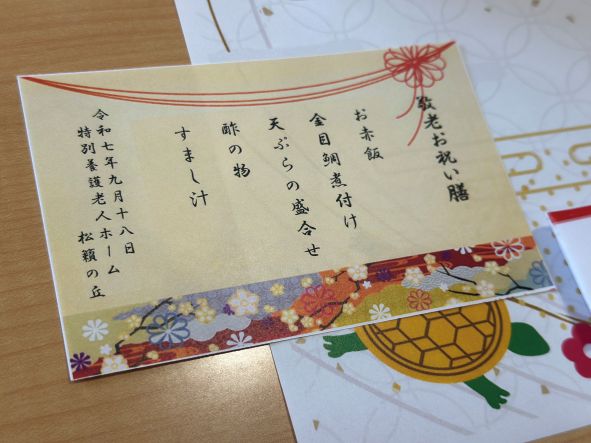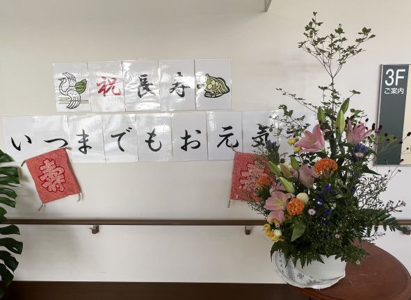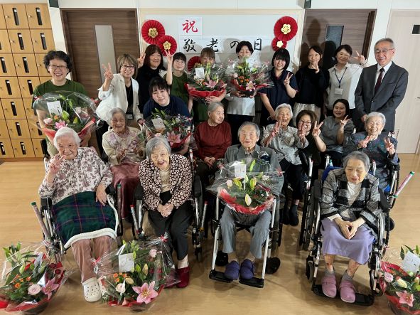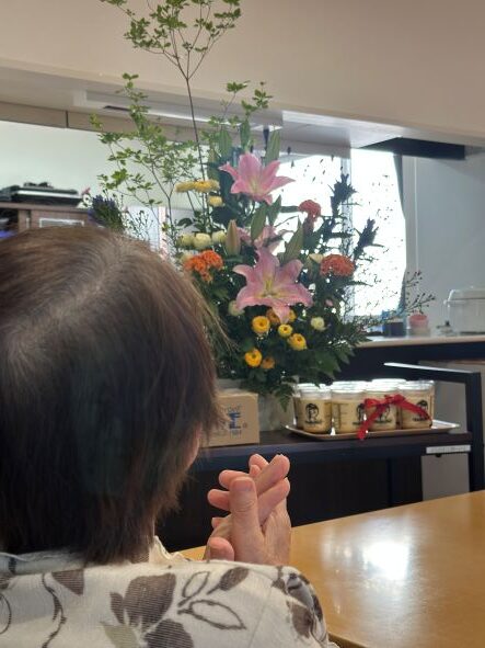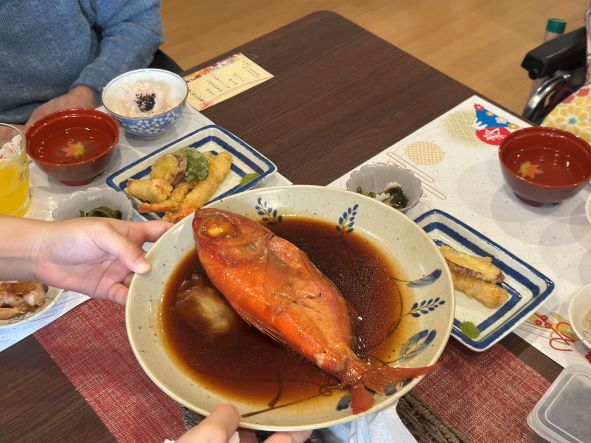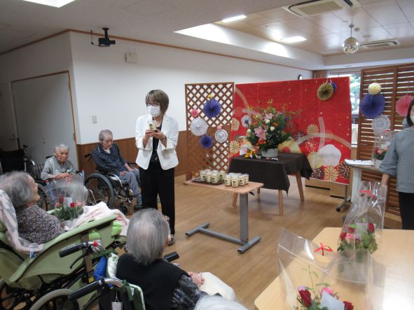 9月18日(木)、各フロアごとに敬老祝賀会を開催し、お祝いをしました。今年のお祝いのお膳は、お赤飯に金目の煮付けを添えました。尾頭付きの立派な金目に『美味しい~』と皆様大変喜ばれていました。おやつには、葉山のマーロウより有名なビーカープリンをお取り寄せして召し上がった頂きました。少し大きいかなと懸念していたビーカープリンですが…大きさは全く問題なかったご様子でした(笑)