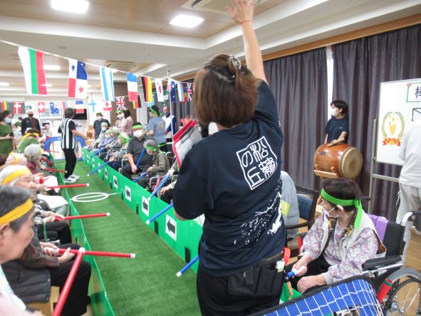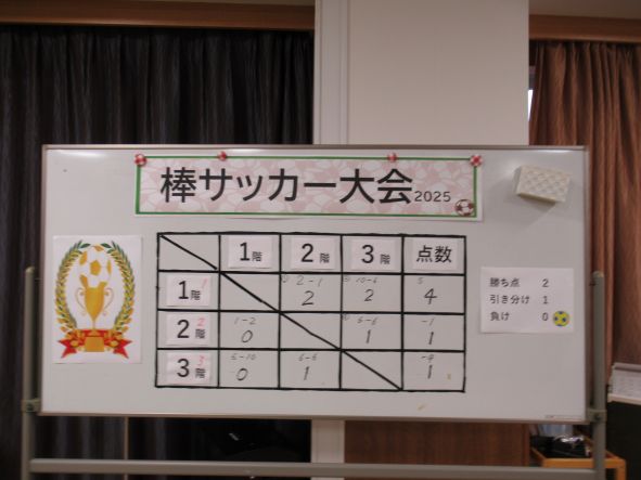 10月21日(火)、恒例の棒サッカー大会を行いました。毎年フロア対抗で白熱した戦いが繰り広げられていますが、ここまでは3階が連覇していました。が、今年は何と無敗で1階が優勝を飾りました!もちろん大会MVPも1階選手(入所者)から選出されました。毎年のことながら、入所者の熱いパワーに職員は驚きを隠せません(笑)。私達も皆さんに負けないように元気に頑張りたいと思います。
