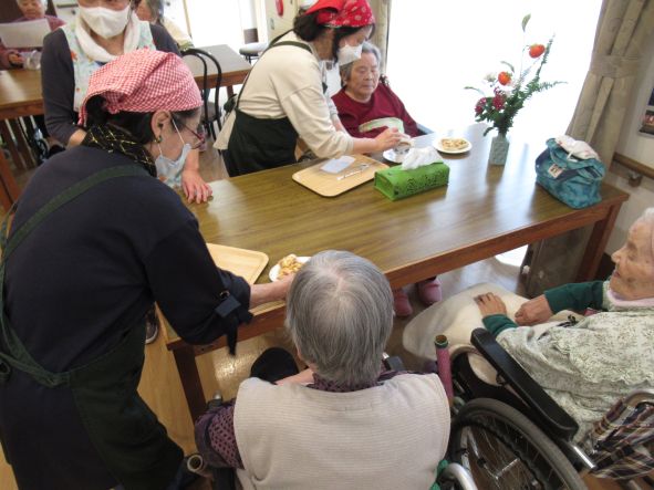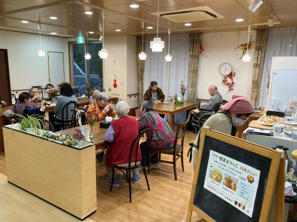 10月31日(金)、毎月、ボランティアの皆さんに来ていただいて開店する『喫茶まりっこ』、10月のメニューはハロウィンにちなんで『かぼちゃプリン』と『ピザトースト』でした。入所者の皆さんがとても楽しみにしている『喫茶まりっこ』、ボランティアの皆さんのご協力で毎月フロアごとに開店することが出来ています。心から感謝の気持ちでいっぱいです。ありがとうございます。