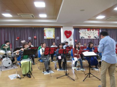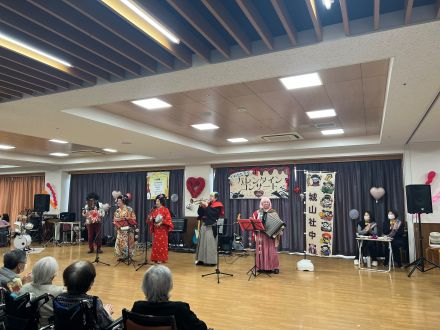 地元の皆様のご協力のもと、初のイベント「心あたたまるバレンタインコンサート」を開催いたしました。迫力ある演奏や職員によるダンスを披露!会場は拍手と笑顔に包まれました。また、ホールでの演奏後にちんどんバンド城山社中さんが各居室を回ってくださり、会場に来られなかった入所者にも音楽を届けることができました。曲に合わせて手踊りをしたり、涙ぐまれる方もいました。心あたたまる交流により思い出深い時間となりました。 ご出演いただきました地域の皆さまに、心より感謝申し上げます。ありがとうございました。